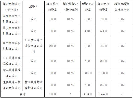 為滿足子公司的生產(chǎn)經(jīng)營需要,子公司股東擬以現(xiàn)金形式對部分子公司進行增資,增資價格為每一注冊資本1元。增資明細如下(單位:萬元):