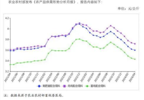 農(nóng)業(yè)農(nóng)村部發(fā)布《農(nóng)產(chǎn)品供需形勢(shì)分析月報(bào)》顯示,從周數(shù)據(jù)看,飼料價(jià)格已連續(xù)30周下跌,4月第3周育肥豬、肉雞、蛋雞配合飼料價(jià)格分別為每公斤3.59元、3.71元、3.42元,比上年9月價(jià)格高點(diǎn)分別跌9.3%、跌8.6%、跌8.8%。