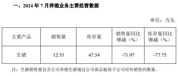 2024年7月末,公司生豬存欄47.54萬頭,較2023年7月末減少77.75%,較2023年12月末減少56.68%,較2024年6月末增加4.90%。