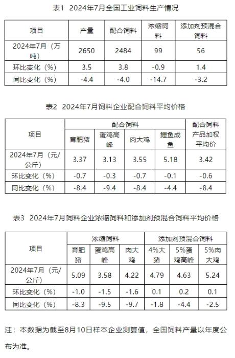 據農業(yè)農村部畜牧獸醫(yī)局、中國飼料工業(yè)協(xié)會8月19日消息,2024年7月,全國工業(yè)飼料產量2650萬噸,環(huán)比增長3.5%,同比下降4.4%。主要配合飼料、濃縮飼料產品出廠價格環(huán)比、同比均呈下降趨勢,添加劑預混合飼料產品出廠價格同比小幅下降。飼料企業(yè)生產的配合飼料中玉米用量占比為29.8%,同比增長2.4個百分點;配合飼料和濃縮飼料中豆粕用量占比為12.4%,同比下降1.4個百分點。