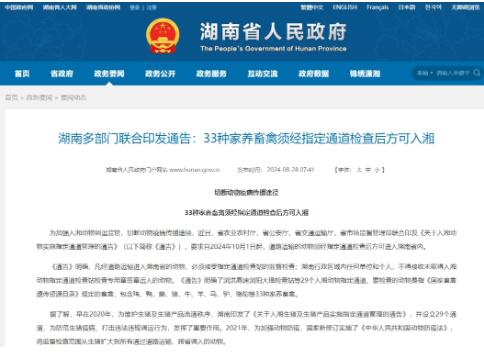 為加強(qiáng)入湘動(dòng)物調(diào)運(yùn)監(jiān)管,切斷動(dòng)物疫病傳播途徑,近日,省農(nóng)業(yè)農(nóng)村廳、省公安廳、省交通運(yùn)輸廳、省市場(chǎng)監(jiān)督管理局聯(lián)合印發(fā)《關(guān)于入湘動(dòng)物實(shí)施指定通道管理的通告》(以下簡(jiǎn)稱《通告》),要求自2024年10月1日起,道路運(yùn)輸?shù)膭?dòng)物須經(jīng)指定通道檢查后方可進(jìn)入湖南省內(nèi)。