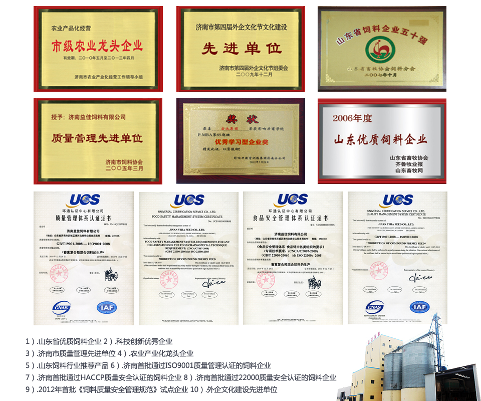 歷經十幾年發(fā)展,公司堅持功能、品質、價格、服務,一切為客戶著想,目前產品以質量先進、品質穩(wěn)定、性價比高,深得用戶的喜愛和好評,并得到了主管部門和業(yè)界的認可,曾先后被評為質量管理先進單位、用戶信得過品牌、優(yōu)質飼料企業(yè)等榮譽稱號;歷任山東省飼料分會常務理事單位、山東省飼料科技專業(yè)委員會常務理事單位、山東養(yǎng)豬學會副會長單位;2010年被認定為濟南市農業(yè)產業(yè)化龍頭企業(yè);也是山東省率先通過ISO9001國際質量管理體系和ISO22000食品安全管理體系雙體系認證的飼料企業(yè)。